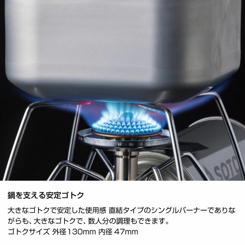 また、連続使用によるドロップダウンの影響を受けにくいマイクロレギュレーターの特性に加え、大きなゴトクを装備することで数人分の料理もこなすことができます。