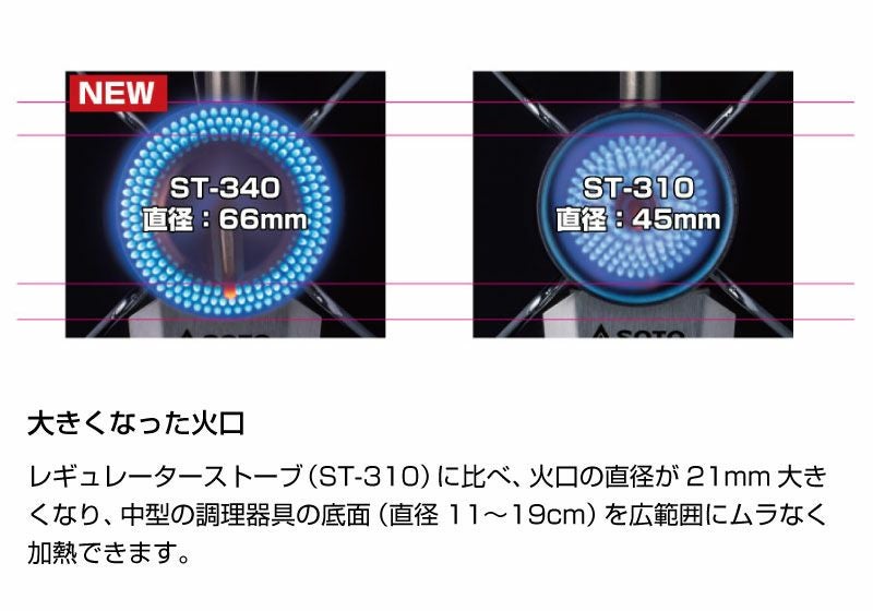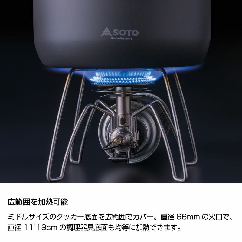 また、連続使用によるドロップダウンの影響を受けにくいマイクロレギュレーターの特性に加え、直径66mmの火口により中型(直径11〜19cm)の調理器具と相性が良く、調理器具の底面を広範囲でムラなく均等に加熱できます。