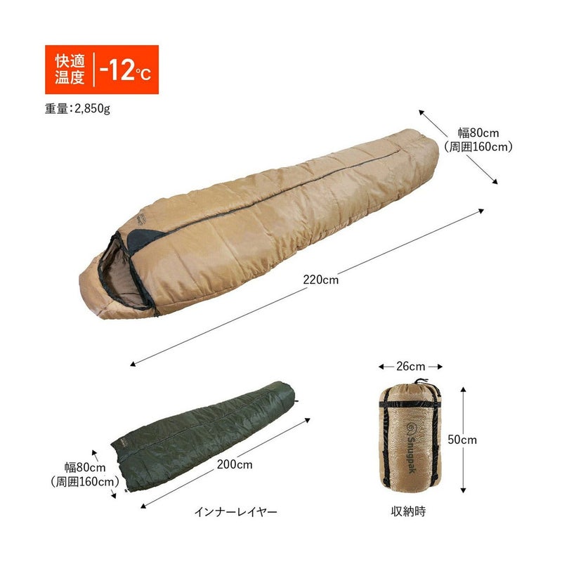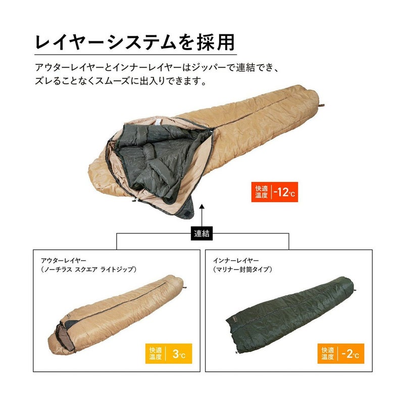 ●2枚の寝袋を重ねて使うレイヤー仕様、1枚で使うこともできるため-3つの温度帯(3℃/-2℃/-12℃)に対応可能。