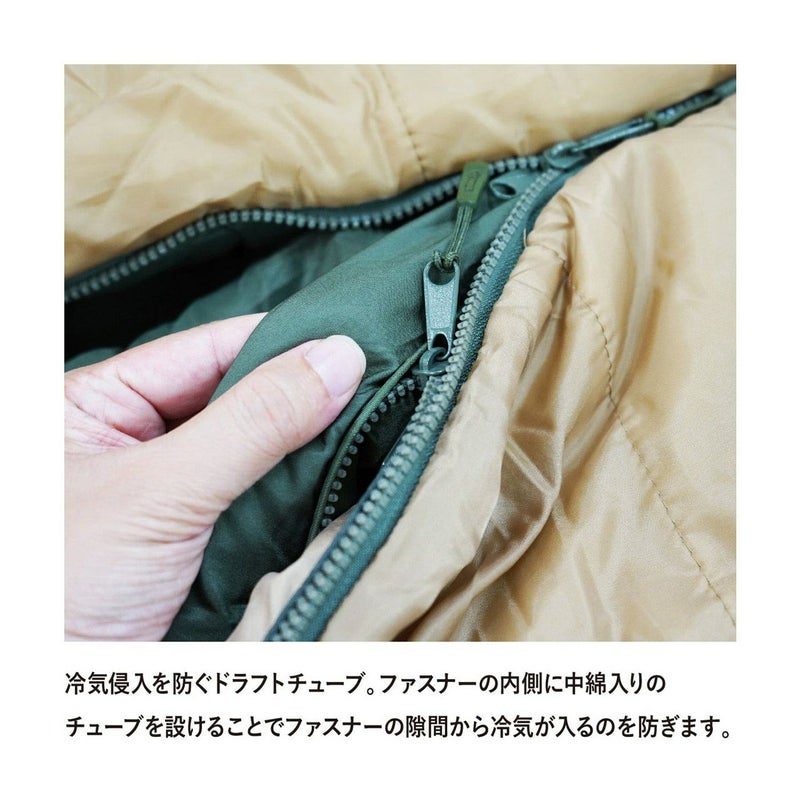 ●上部からの冷気を防ぐドローコード付きのフード、首からの冷気侵入を防ぐショルダーウォーマー、ファスナーからの冷気侵入を防ぐドラフトチューブ、寒い夜を快適にすごすため細かいところまでこだわり作り込まれています。