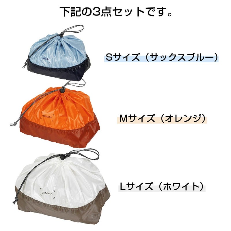 Sサイズ(サックスブルー)、Mサイズ(オレンジ)、Lサイズ(ホワイト)の3枚セットです。
