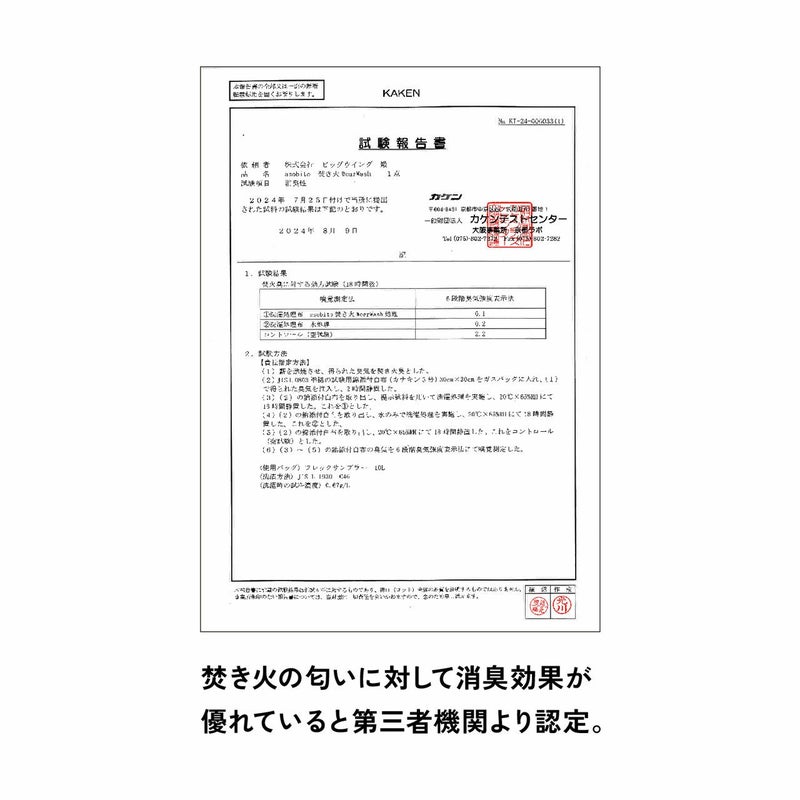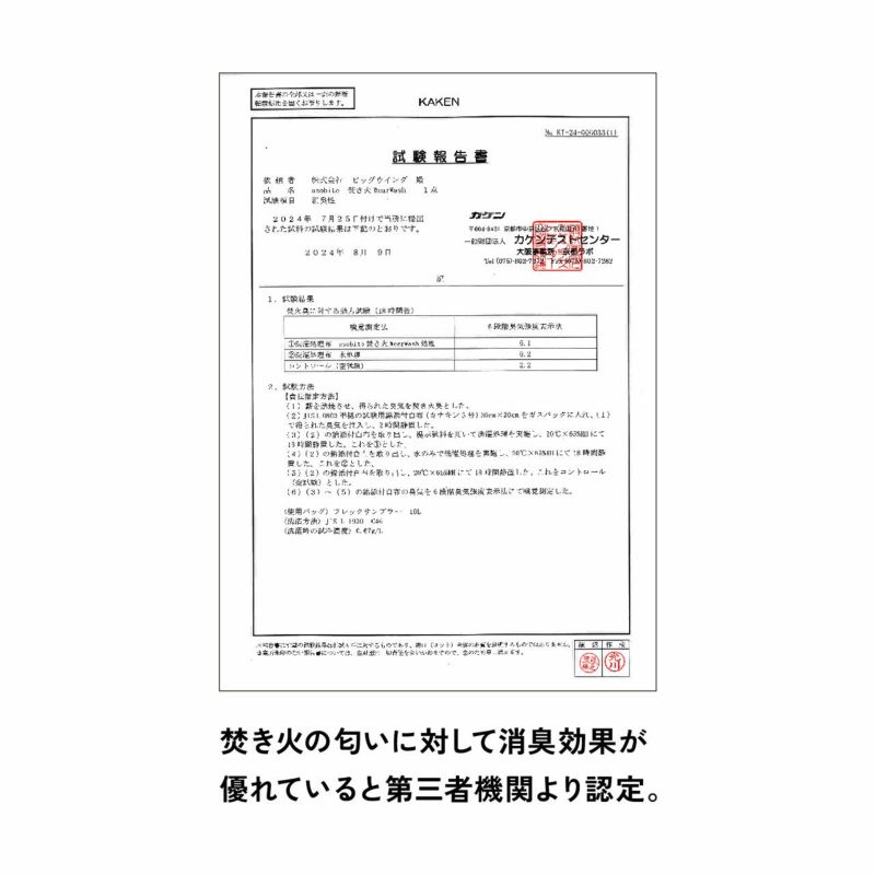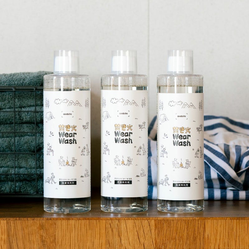 ●「焚き火ウェアウォッシュ」は日本で初めて焚き火の消臭効果が認められた衣料用洗剤です。焚き火の匂いの主たる成分を特定し、消臭する成分を独自に配合して一般的な衣料用洗剤よりも焚き火の匂いに対して消臭効果が優れていると第三者機関に認められました。