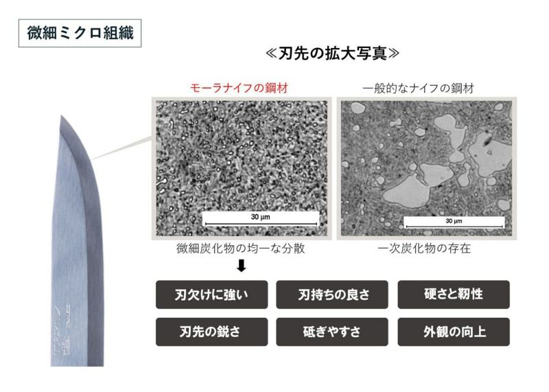 そこにモーラナイフが独自に加工・製造を加え、他のナイフメーカーの鋼材と比較しても、出すことが難しい切れ味や耐食性を実現しており、他の追随を許しません。