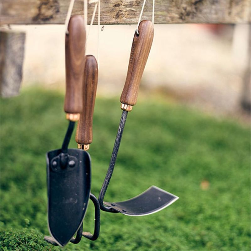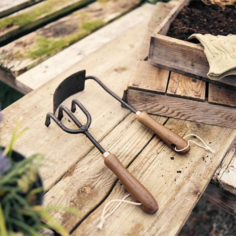 ウォールナットのハンドルとステンレススチールでできた、デザイン性・耐久性の高い園芸用の小型のクワです。