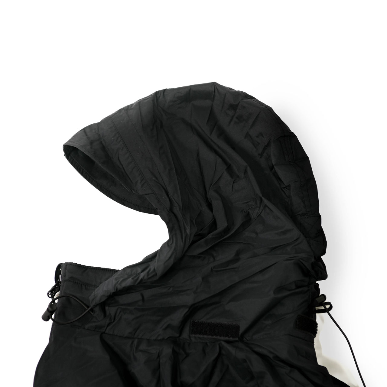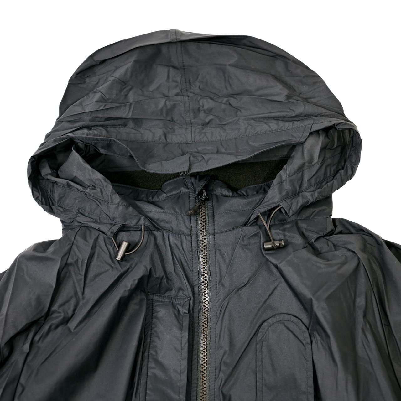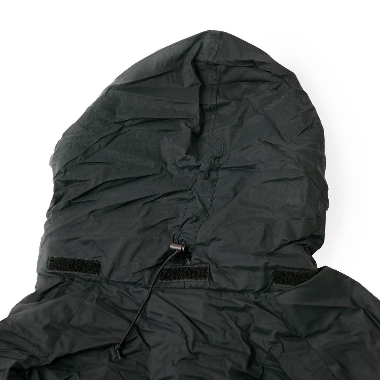 折り畳みの簡易フードを襟裏に収納し、襟と裾にドローコードを配置。