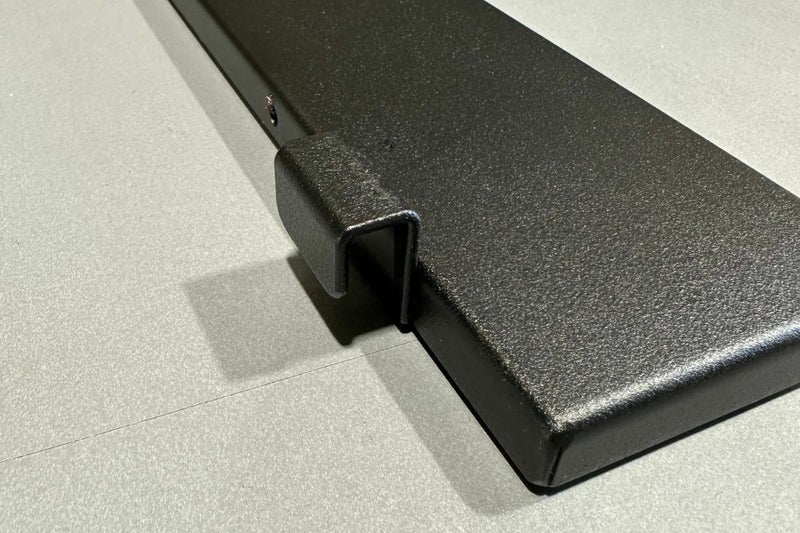 写真2枚目のフックをシェルフコンテナやフィールドラックに引っ掛けて、テーブルや調理台としてお使い頂けます。