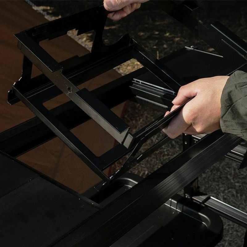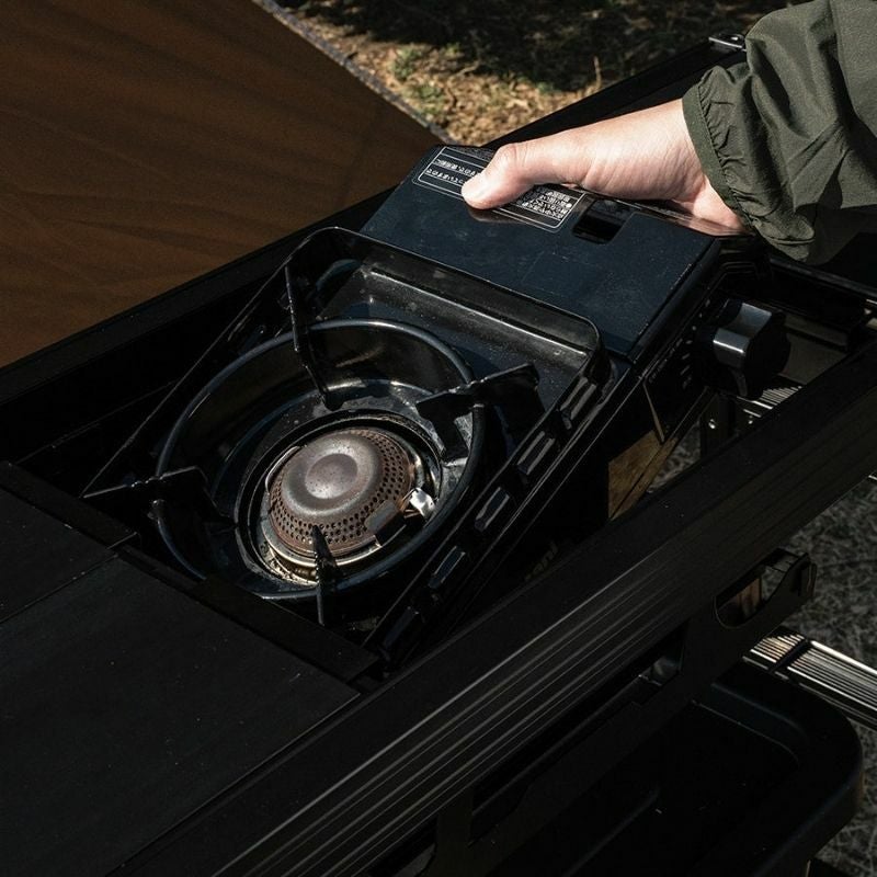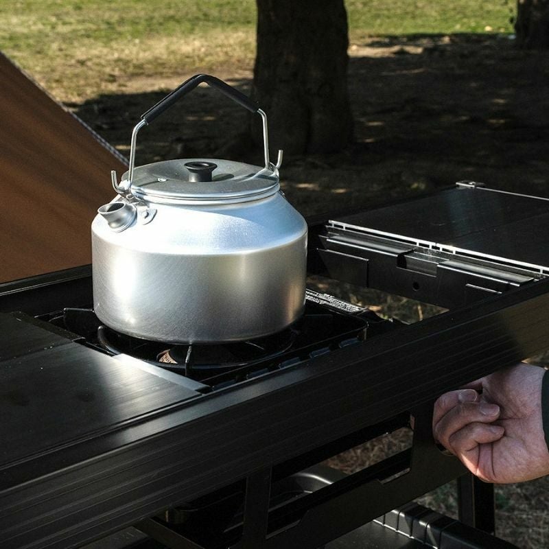 コンロを使用しない時には、アルミグリルテーブルに付属の天板を乗せることでフラットに。