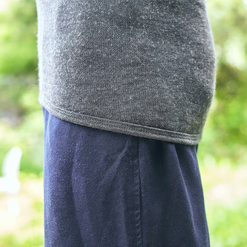 手首はリブ編み仕様で、丈はかがんでも背中が出にくい、後ろ側が少し長くなったデザイン。