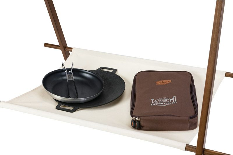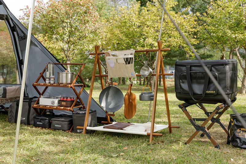 パズルのように縦、横、上に連結できて、テーブル使用もできるマルチアウトドアラック