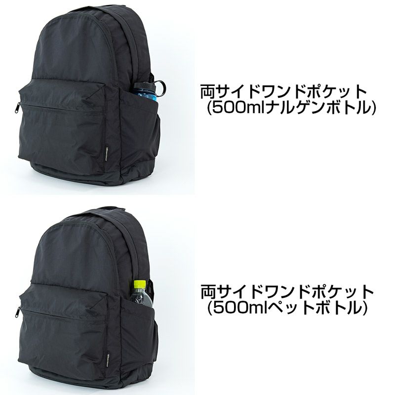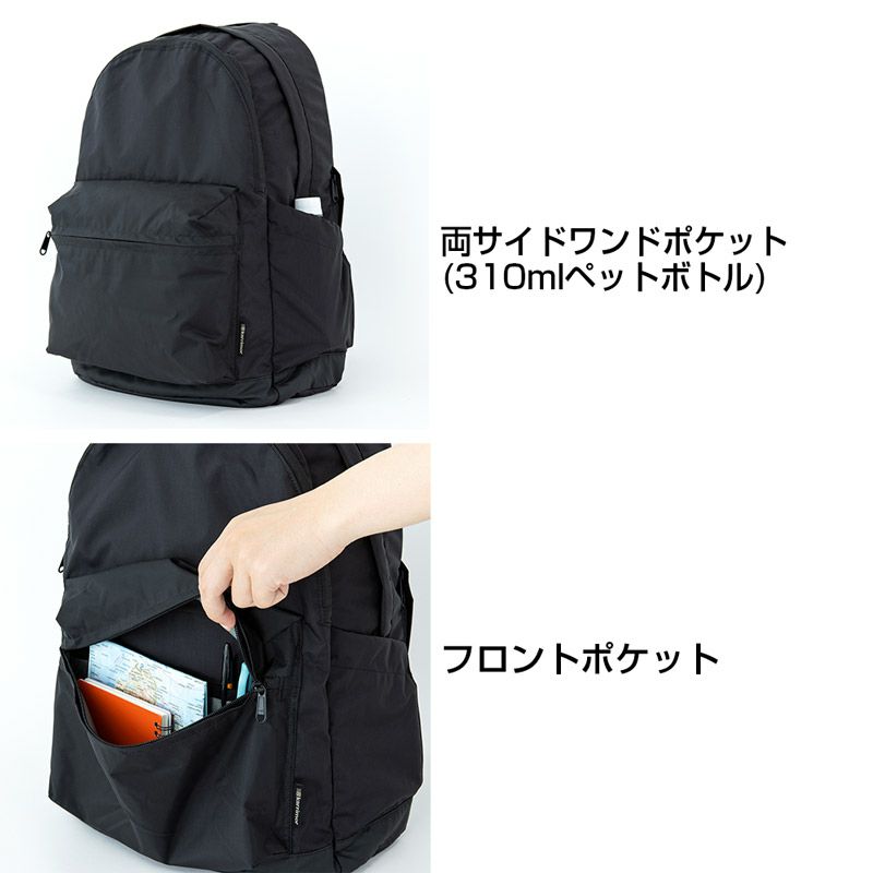 シンプルなデザインながら、サングラスやメガネを直接収納可能な起毛素材を使用したポケットなど、旅行や日常使いに便利な充実の機能を備えた中型リュックサック。