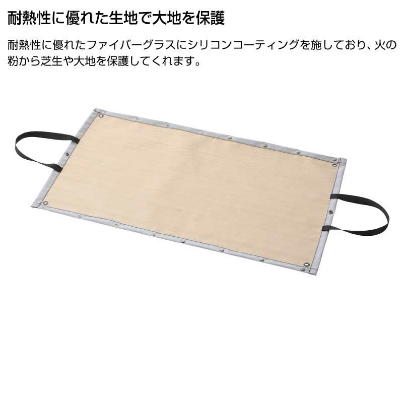 ※本製品はロゴスピラミッドグリルなど熱源から地面まで十分な距離のある「焚き火台」の平均的な熱量を使用基準として設計され、設置場所に伝わる熱をやわらげることを目的としております。熱を完全に遮断するものではありませんのであらかじめご留意ください。