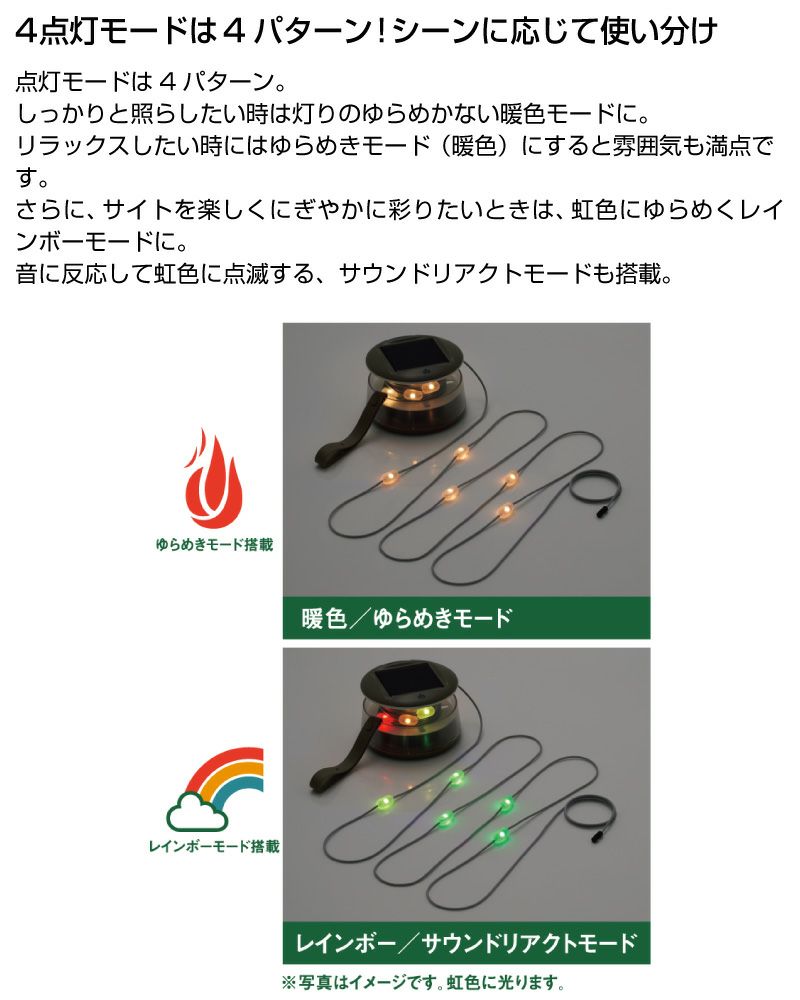点灯モード:暖色/ゆらめき/レインボー/サウンドリアクト
