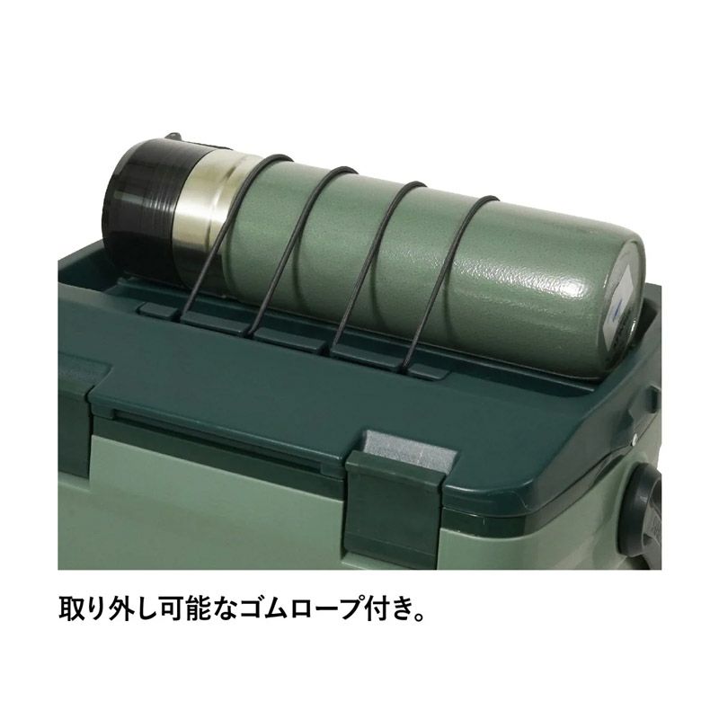 フタ上部のゴムロープにはボトル、レジャーシートなどクーラーボックスと一緒に持ち運びたい道具を挟むことができます。