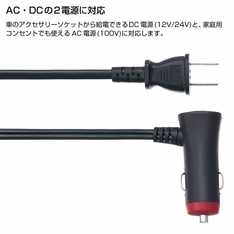 更に家庭用コンセントだけでなく、DC12Vでも使用できるので、車のアクセサリーソケットで作動させることができます。