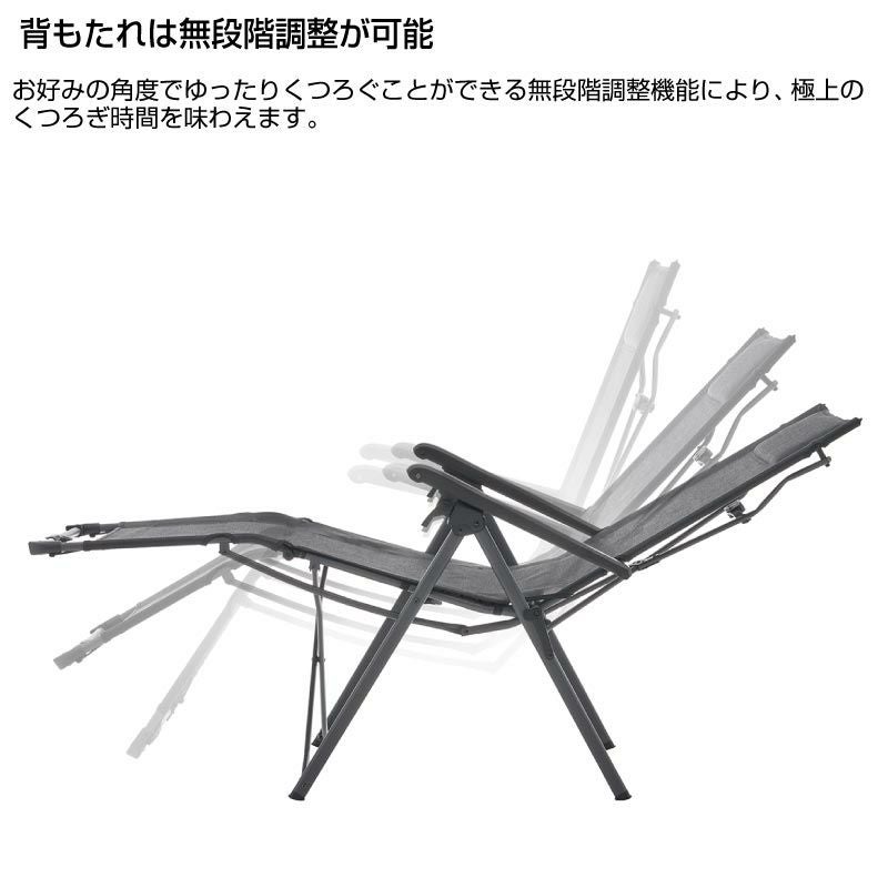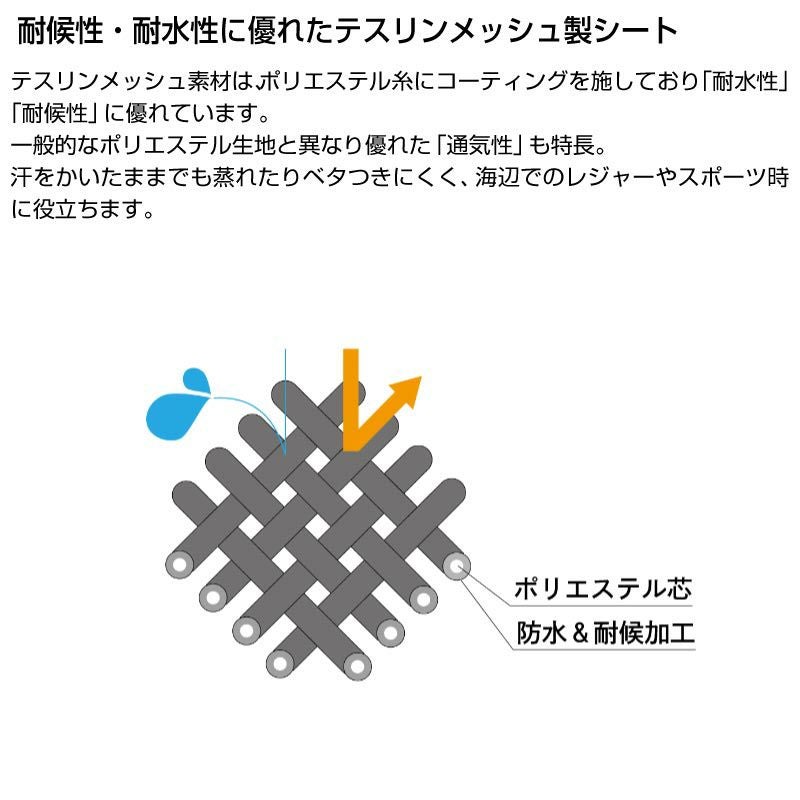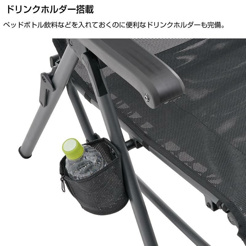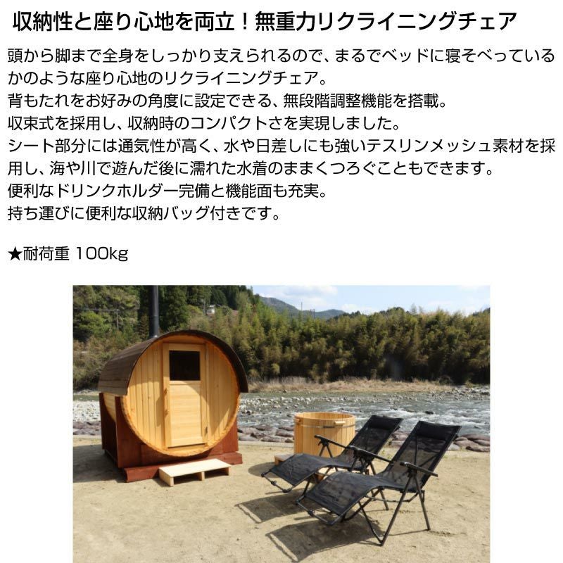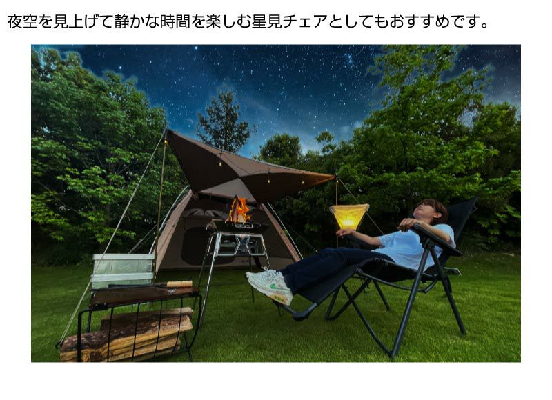 収納性と座り心地を両立! 無重力リクライニングチェア! 頭から脚まで全身をしっかり支えられるので、まるでベッドに寝そべっているかのような座り心地のリクライニングチェア。 背もたれをお好みの角度に設定できる、無段階調整機能を搭載。 収束式を採用し、収納時のコンパクトさを実現しました。 シート部分には通気性が高く、水や日差しにも強いテスリンメッシュ素材を採用し、海や川で遊んだ後に濡れた水着のままくつろぐこともできます。 便利なドリンクホルダー完備と機能面も充実。