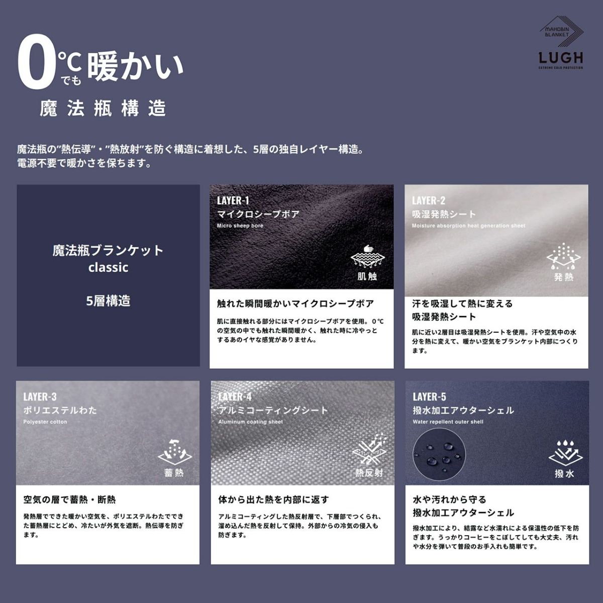 他の画像を見る 魔法瓶のように熱伝導・熱放射を防ぐ、暖かさが持続する独自の5層構造のブランケット。 LUGH 魔法瓶ブランケットclassic ラージ L フォギーブラック サンセットレッド 販売価格 ¥ 13,200 税込 在庫切れ カートに入れる お気に入りに登録する