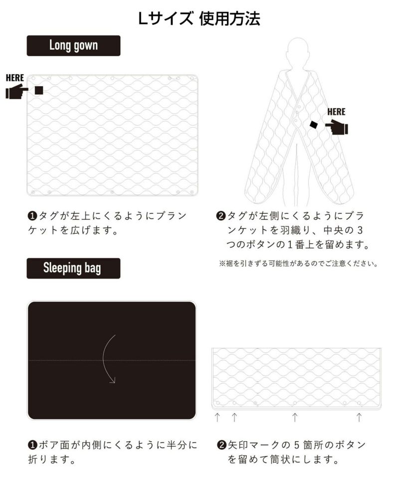 ポンチョや寝袋、ラグやスカートなど、L・XSサイズ別にアレンジも様々。