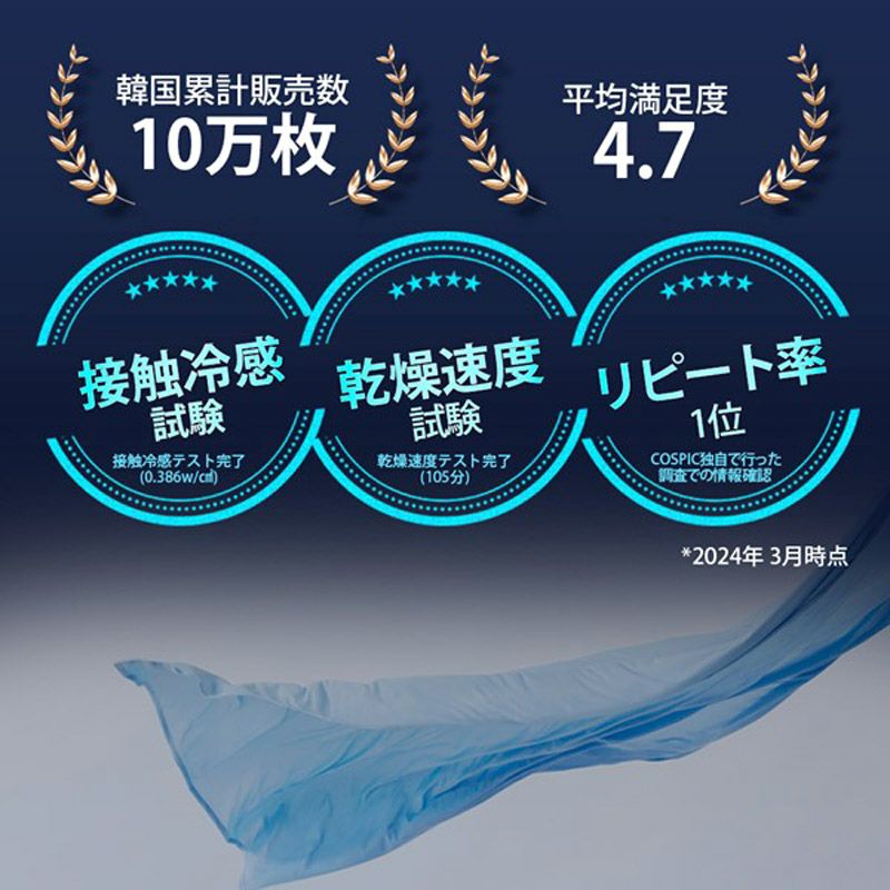 ※このテストは冷感生地(ブルーカラー)で行い、実際の乾燥速度は使用環境によって異なる場合があります。 |
