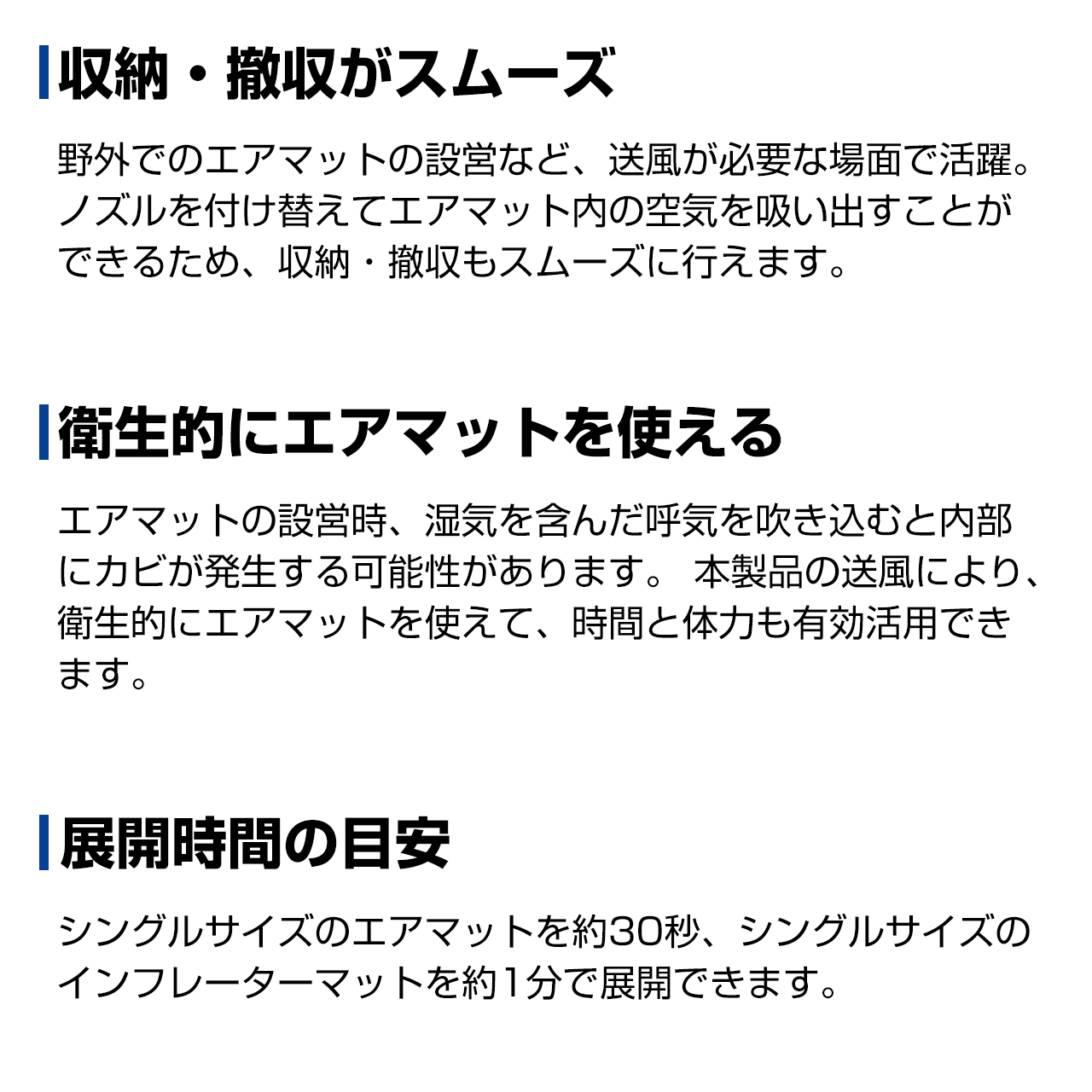 アウトドアシーンにおけるエアマットの展開・収納などで活躍するエアポンプです。