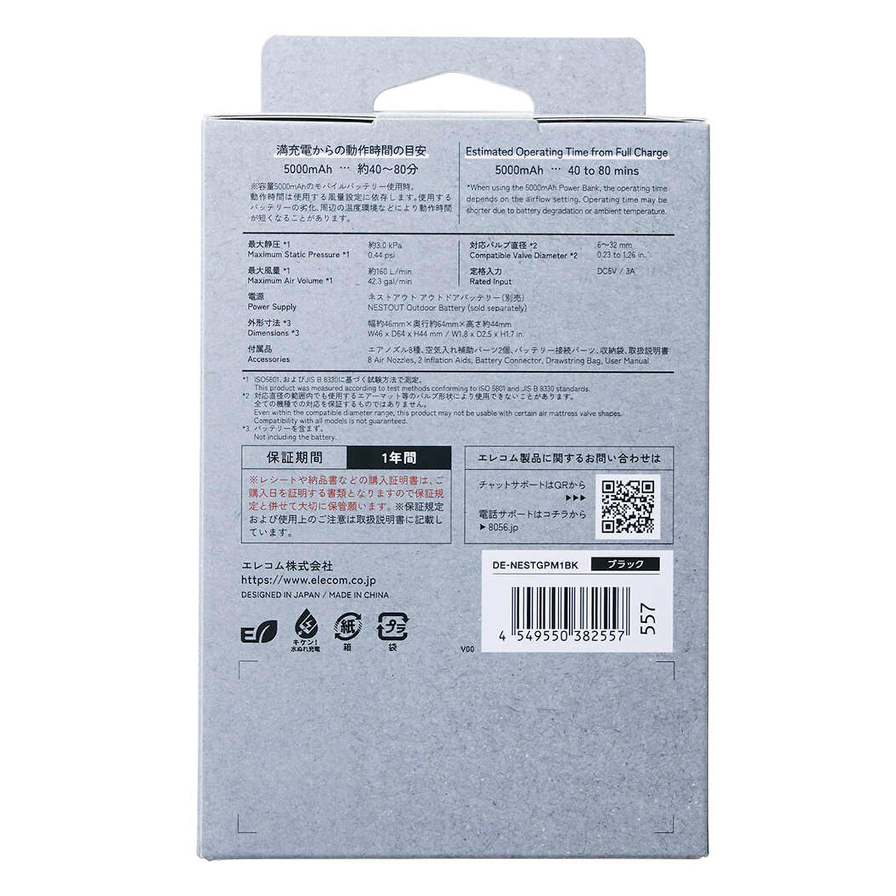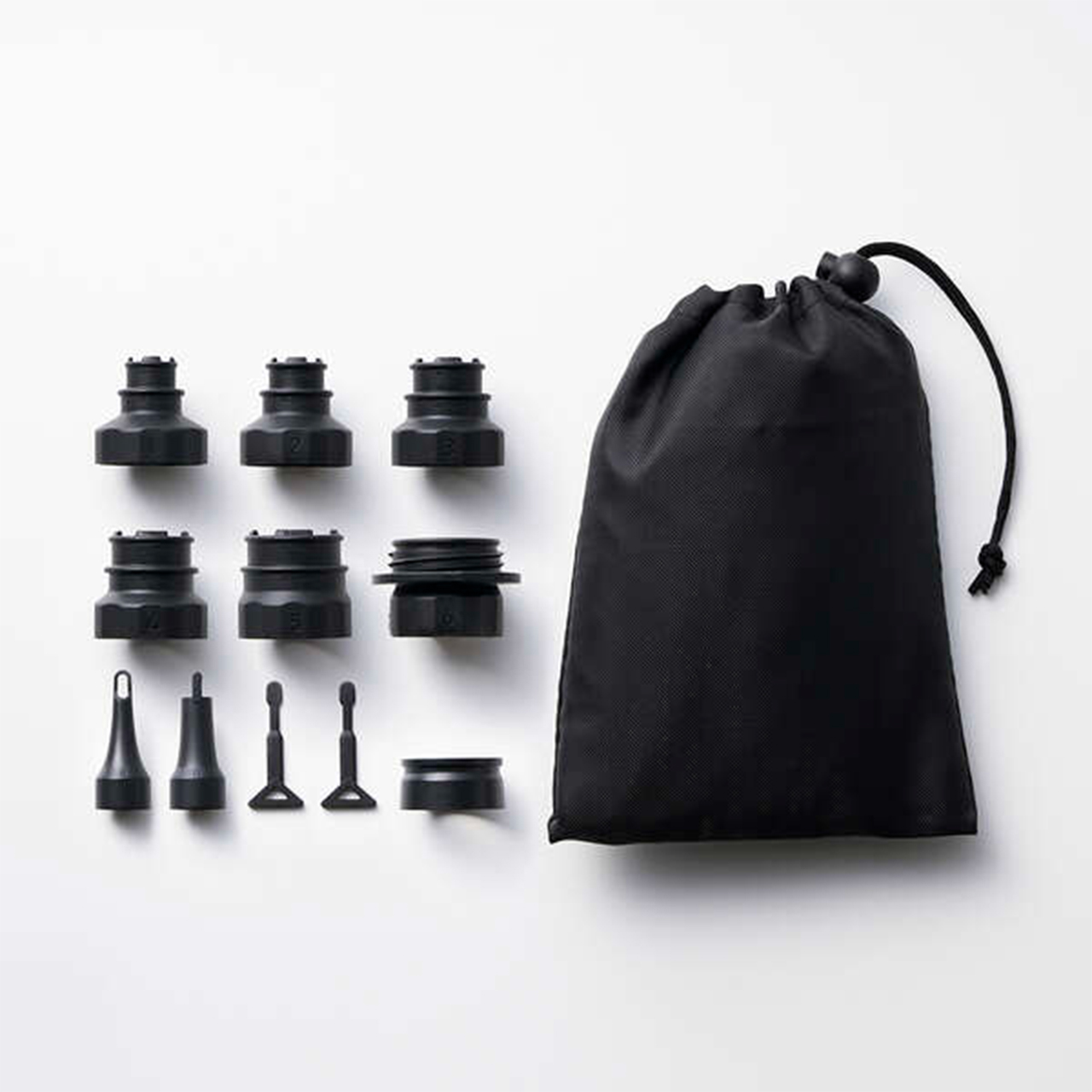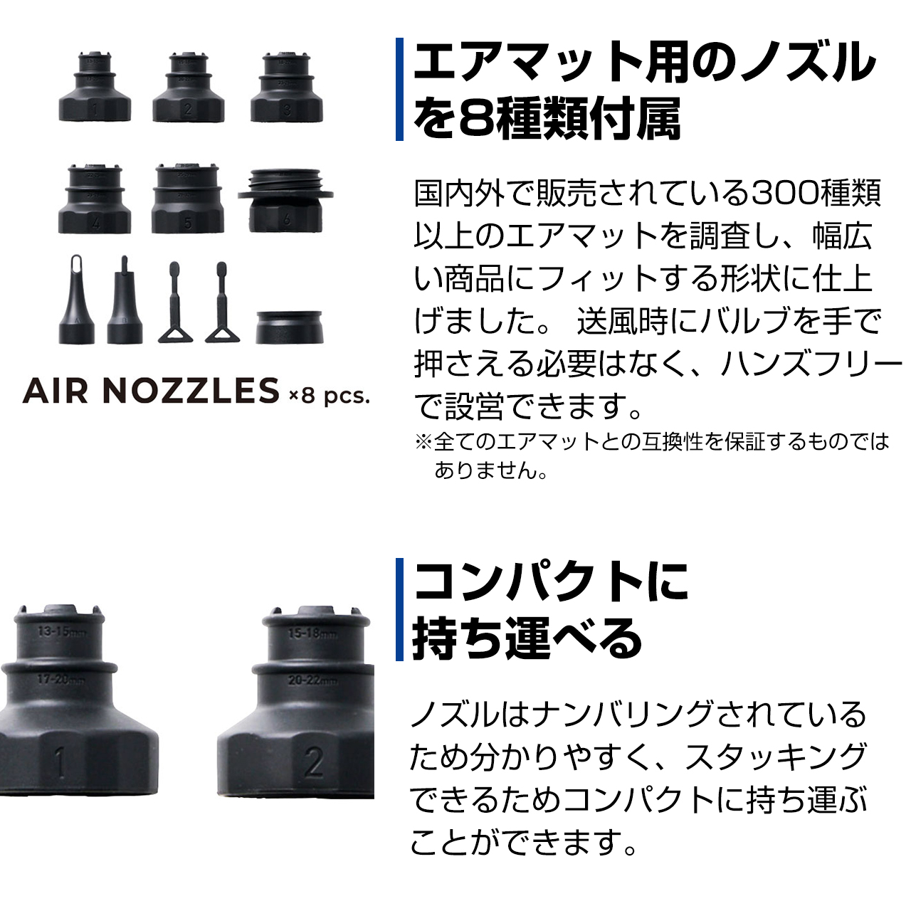 付属品:エアノズル8種、空気入れ補助パーツ2個、ネストアウト アウトドアバッテリー接続パーツ、収納袋、取扱説明書