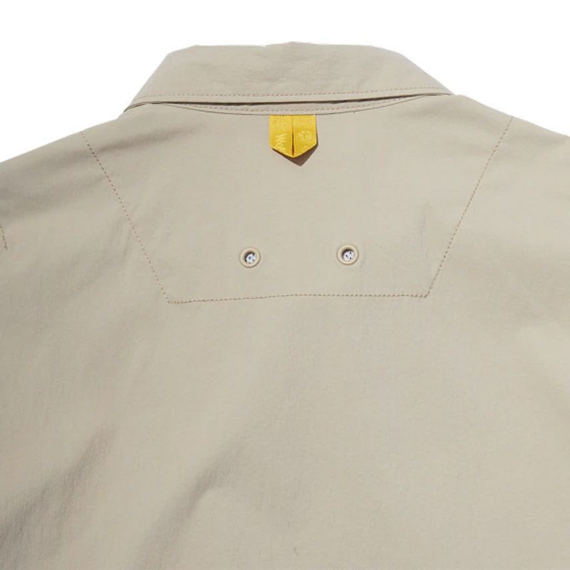 両腹に配したマチ付きのフラップポケットやDリング、マルチタブ、右胸のトランシーバー用ポケットなど、キャンプやアクティブシーンに有効な収納ディテールを多数備えた、高機能なボタンシャツ。