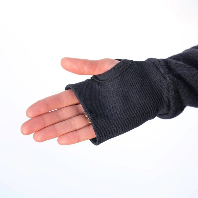 ハイネックの襟元や、サムホールが付属した長めの手首まわり、かがんだ時に背中が出ない丈は、