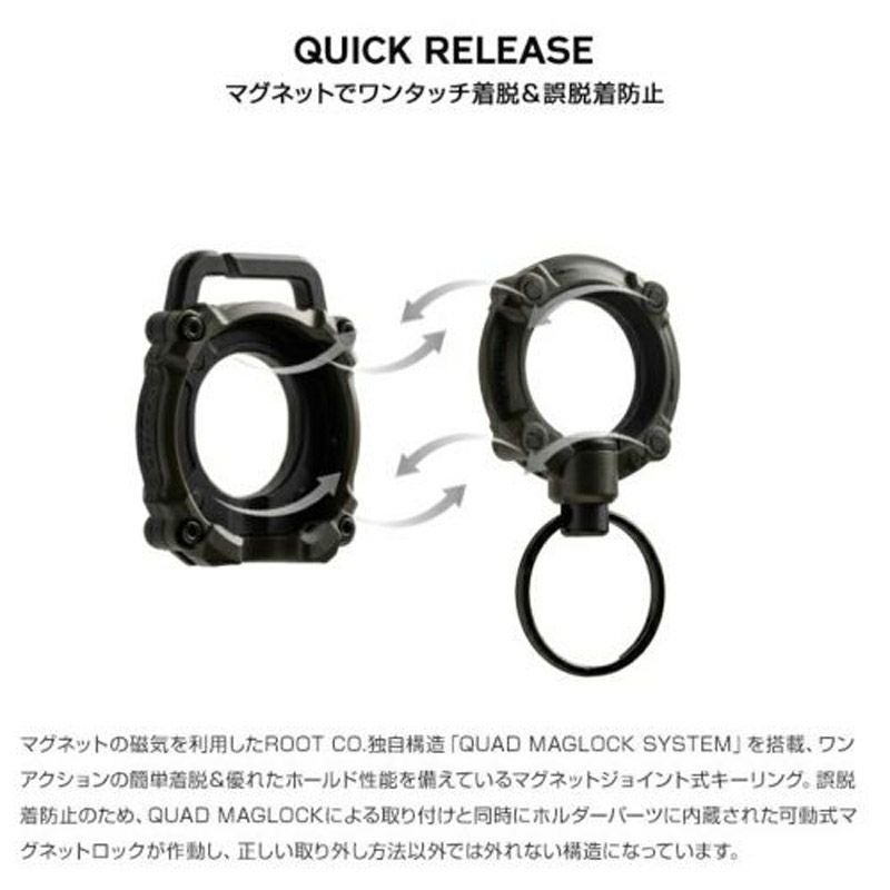 ROOT CO.オリジナルのマグネット式ジョイントロックシステム【QUAD MAGLOCK】。製品のホルダーパーツとキーリングパーツそれぞれにマグネットを配置し、磁気を利用してクイックホールド&クイックリリースを実現する仕組みです。