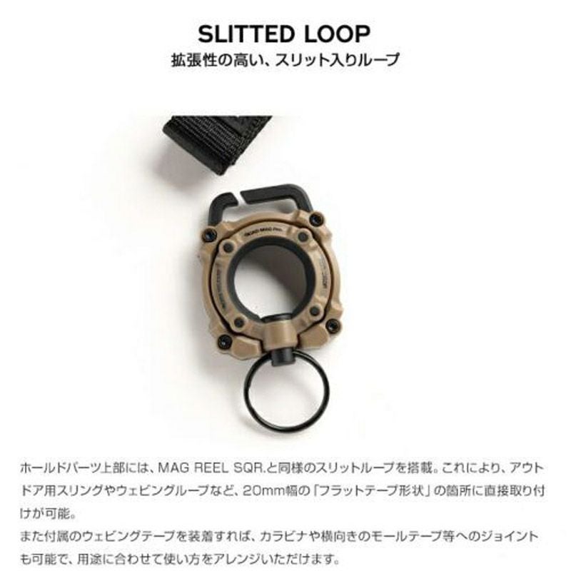ホールドパーツ上部には、MAG REEL SQR.と同様のスリットループを搭載。これにより、アウトドア用スリングやウェビングループなど、20mm幅の「フラットテープ形状」の箇所に直接取り付けが可能。