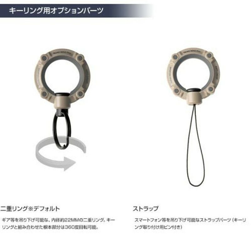 ギア等を吊り下げ可能な、内径約22mmの二重リング。キーリングと組み合わせた根本部分は360度回転可能。
