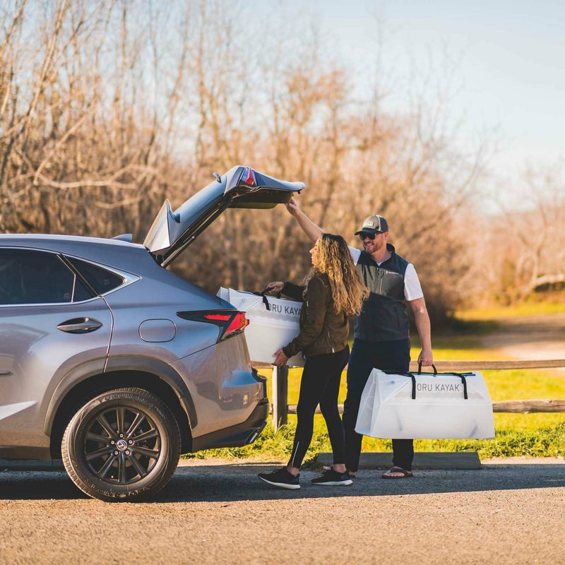 短距離はボックス中央のハンドル、長距離は専用のカヤックパックを推奨します。